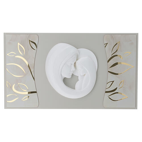 Virgin Mary with Child picture in a modern style, executed in white tones with gold decorations. The raised composition emphasizes the central subject, set against a background decorated with stylized motifs. Designed as a decorative element for domestic interiors or dedicated spaces, it adapts to various furnishing solutions. It is equipped with two metal hooks on the back for secure and stable wall mounting. Dimensions: 40x70 cm.
