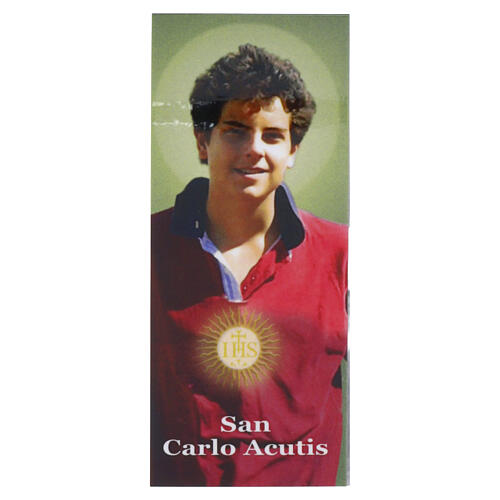 Vertical magnetic bookmark (10x5 cm) printed on laminated cardstock with a full-color image of Saint Carlo Acutis on the front and a dedicated prayer on the back. The glossy lamination protects the surface and enhances the image's color. Flexible and lightweight, with finished edges for a neat presentation. Made in Italy with careful printing and selected materials.