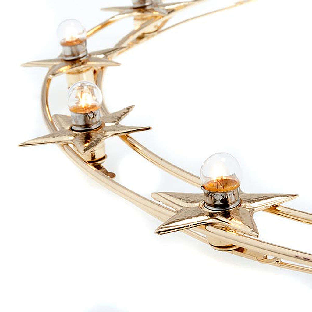 Luminous halo with mount in gilded brass with bulbs, 40 cm diameter. This halo has 12 lighted stars with small bulbs in the middle and it comes with a 220V/24V transformer with an european plug.