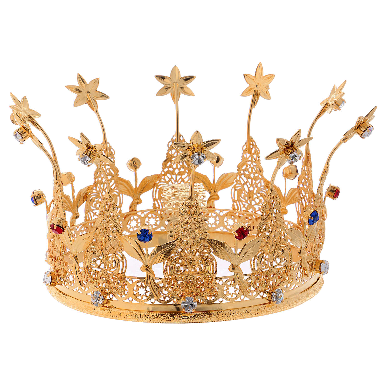 Royal crown for statues with stones and flowers 6.3 inches. Crown with filagree design, enriched by red, white and blue stones and flowers with white gems.