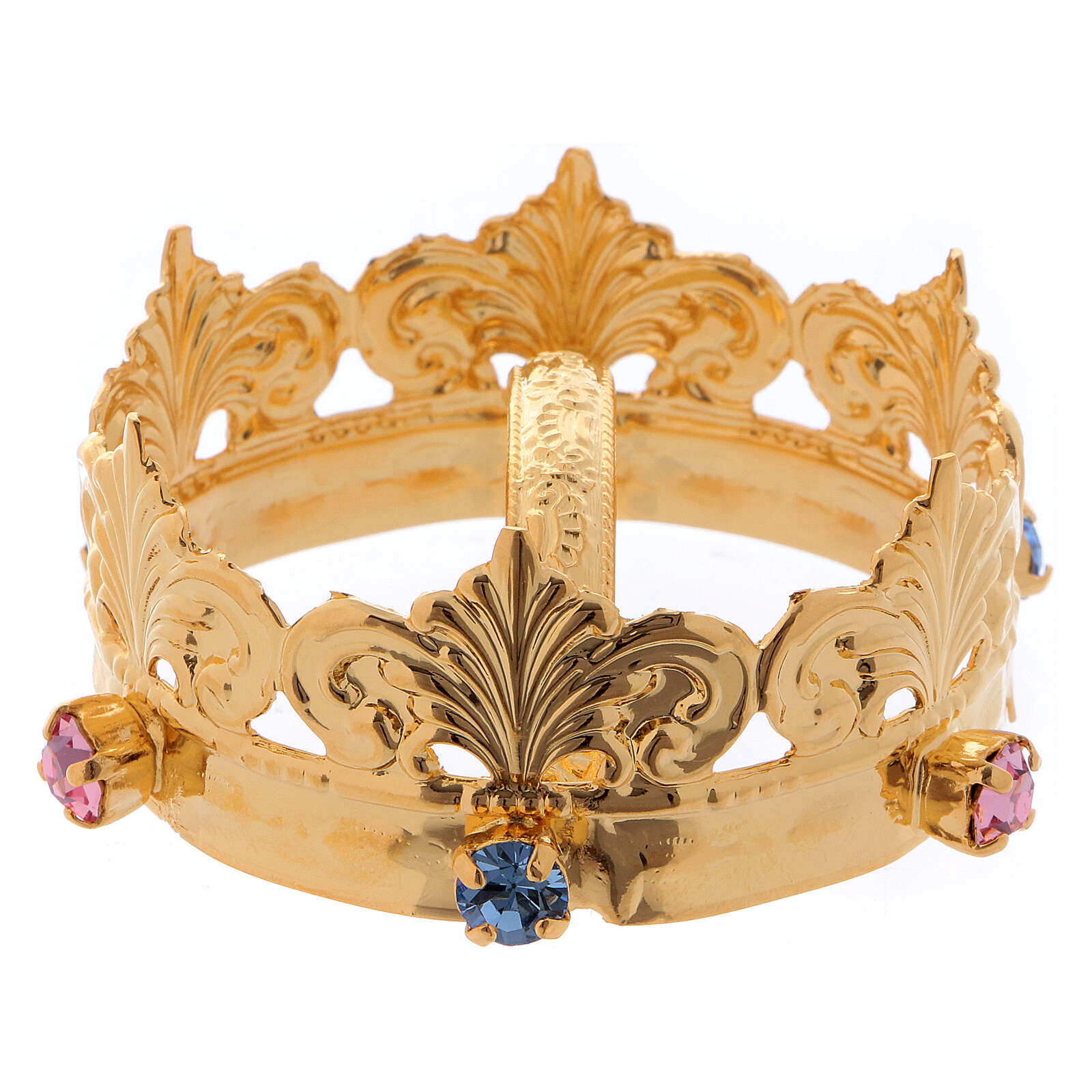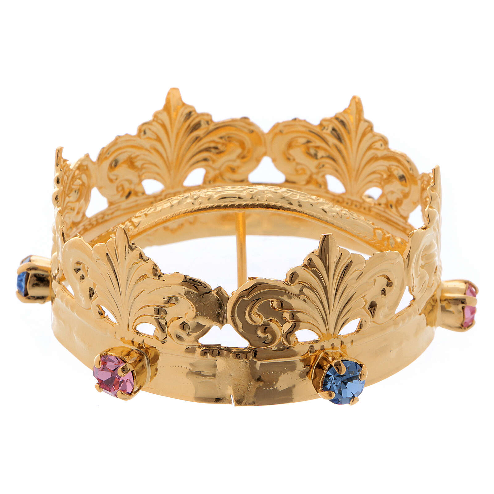 Small gold plated crown for statues with stones 2 inches. Crown for statues made of polished gold plated metal with blue and pink stones.
