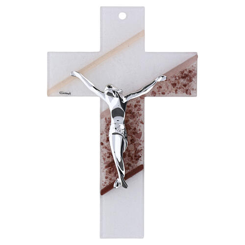 Murano glass wall cross with pink-toned diagonal inserts, measuring 25.5 x 14.5 cm. Satin-finished white Murano glass with smooth edges and linear arms. Two diagonal bands feature pigment inclusions in shades of pink and burgundy fused into the glass. A stylized Christ figure in a silvered alloy with a glossy finish is applied in relief at the center, creating a contrast between the matte glass background and the metallic sheen. Handmade in Italy; delivered in a rigid white box with a certificate of quality and origin. Supplied with a hole for wall hanging.
