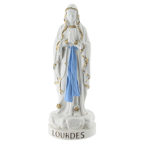 Our Lady of Lourdes statue in white resin with gold and blue details, 10 cm. Catholic statue depicting Our Lady of Lourdes, cast in white resin with golden trim and a blue frontal sash. The figure stands with a rosary hanging from her hands; the pedestal features an embossed inscription and floral decoration at the feet. The veil edge and garment folds are finished in gold, while the front sash is painted blue for contrast. The stable, compact base is suitable for display on shelves, altars or i...