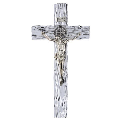 St Benedict cross silver-plated with wood-effect finish 16x8 cm. The wall crucifix is made in Italy, featuring a resin cross with a wood-effect surface and silver-plated detailing. The piece measures 16 cm in height and 8 cm in width, with a textured finish that reproduces the natural wood grain. The corpus is in polished silver-plated metal, fixed centrally, and completed by an applied St. Benedict medal. The inscription INRI is in relief at the top of the cross. Made in Italy and presented in a white rigid box; certificate of guarantee and quality included.