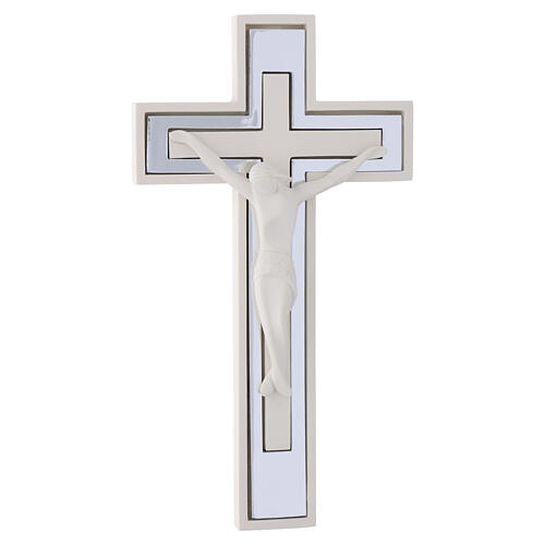 White wall cross with a polished silver border and dark linear insets, featuring a raised Christ figure in matte white resin. The wall cross has a smooth white surface with chrome accents on the outer profile and along the central cross motif, creating a clear contrast between the glossy silver edges and the matte sacred figure. Handcrafted in Italy; delivered in a rigid white box with a certificate of quality and guarantee. Size: 25.5 x 14.5 cm. Includes a hole for wall hanging.