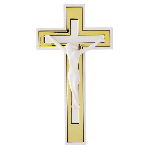 White wall crucifix with gold inserts and matte white resin body, 25x15 cm