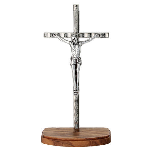 Silver-plated metal crucifix with olive wood base 12 cm