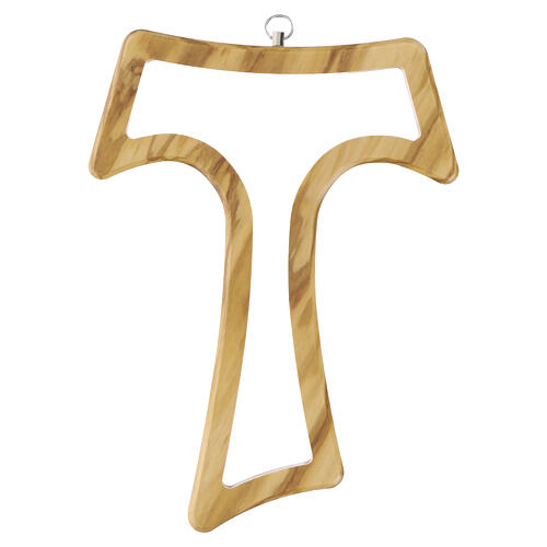 Tau cross, 20 cm, carved in natural olive wood with central opening. Lightened body with central cut-out, regular shaping with a curved profile and smoothed edge, and irregular grain across the surface. 100% handcrafted from solid olive wood and fitted with a metal top eyelet for vertical hanging; smoothed profiles on both sides. Actual dimensions: 20x15 cm.