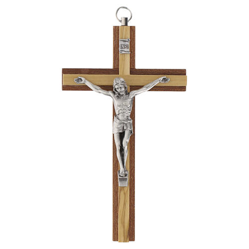 Compact mahogany crucifix with olive wood inserts and silver metal Christ, 15 cm