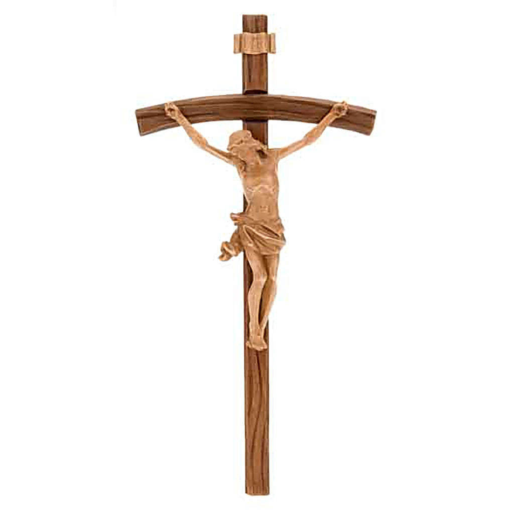 Dark wood curved cross with hand-painted, patinated body. The cross is stylisedw hile the Christ's body is patinated and finely decorated.