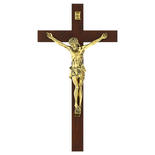 Wall crucifix measuring 63 cm in height and 35.5 cm in width, crafted from dark-stained wood. Adorned with a bronzed resin sculpture of Jesus on the cross. Designed and made in Italy by the renowned brand Valenti Argenti. Delivered in an elegant branded box with a certificate, ideal as a Christian gift. It is equipped with a hanging hook.