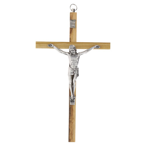 Polished olive wood crucifix with silvered metal Christ 20 cm. Vertical crucifix in smooth olive wood with a raised silver-finished metal Christ, height 20 cm. The cross features a regular profile in light wood with visible grain and squared sections. Christ is sculpted in a metal alloy with a silver finish, fixed centrally, with an INRI cartouche at the top. Made in Italy; components assembled with artisan workmanship and a natural finish on the wooden support. Real size: 20x11.5 cm. Prepared for vertical wall mounting.
