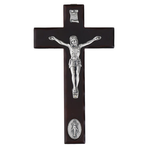 Wall cross 20x10 cm, red enameled wood, with Christ and oval Mary medal in zamak