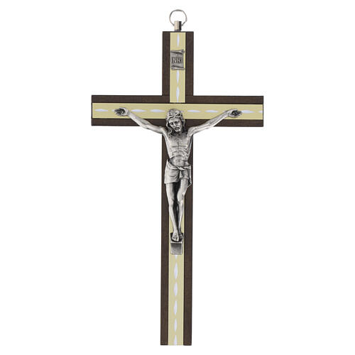 Wall cross crucifix in hornbeam wood with light-toned central inserts and Christ in polished metal. Wall crucifix with a hornbeam cross and pale vertical inlays, die-cast polished metal figure; overall height 20 cm. Hornbeam structure with light vertical bands inset into the central section and a uniform matte finish. Polished die-cast metal Christ with an INRI plaque affixed to the front on a grooved wooden base. Carefully assembled with durable materials and refined metal components, featuring a clean-cut construction. Actual size 20x11.5 cm; ready for wall mounting with an integrated rear recess.