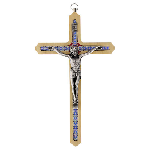 Crucifix made of light wood with Christ and INRI made of metal.The wall crucifix has a floral decoration. The cross is 20 cm high and 11.8 cm wide. The body of Christ is 9.3 cm high.There is a ring attached to the crucifix that allows you to hang the cross on any wall.This wooden crucifix is 100% made in Italy.