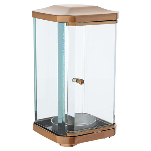 Bronze ground cemetery lamp, 25 cm high. Outdoor ground candle lamp with a bronze-finish metal top, suitable for candles up to 7 cm in diameter and 14 cm in height. Structure with clear glass panels on all sides and an internal flame guard; includes ground-fixing pins for stable installation. Designed for outdoor cemetery use and direct candle handling. Made in Italy by an artistic foundry using manual workmanship and metal casting. Overall dimensions: height 25 cm, base 14x14 cm.