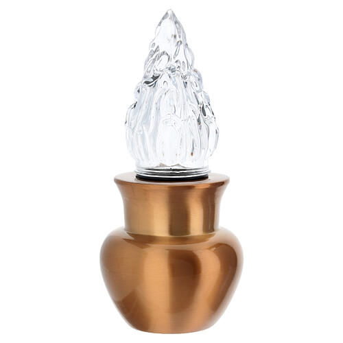 Bronze ground votive cemetery lamp 20x10. Ground cemetery votive lamp made from a metal alloy with a bronze surface finish. The structure features a shaped body with soft contours, a circular base prepared for anchoring and an upper support for a worked glass flame insert. It is supplied with a clear glass flame insert and metal pins for secure ground fixing. Designed for outdoor installation in a cemetery setting, it provides reliable protection for the votive light and safe ground placement. Manufactured in Italy by an artistic foundry specialized in bronze casting for funerary decorations and accessories, with production carried out through successive manual processes. Overall dimensions: 21x10 cm; base diameter: 6 cm.