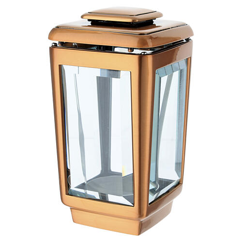 Bronze patinated Cemetery Lamp for 7 cm diameter candles. Brass memorial votive lamp in bronze finish, with a light patina resistant to weather conditions. This protective ground lamp can hold candles up to a maximum diameter of 7 cm and a maximum height of 18 cm. This lamp for graves features elegant and timeless lines. It measures 23x12.5x12.5 cm and has a ground footprint of 8.5x8.5 cm. It comes with fixing pins and flame arrester, included. This cemetery lamp for graves is made in Italy, using high-quality materials and crafted through numerous artisanal steps. The historic foundry where it is produced is renowned for creating durable and refined artistic funerary items.