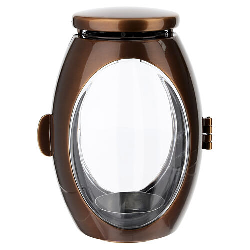 Cemetery lamp votive candle holder for 8 cm diameter candles, bronze finish. Ground-mounted votive lamp for outdoor cemetery use, made of metal with a bronze finish and compact construction. The silhouette is oval with rounded sides, a continuous profile and a large front transparent glass window set into the metal body. The structure incorporates an internal flame arrester and fixing pins for anchoring to the ground, and features a side hinged opening for inserting the votive candle. Suitable f...