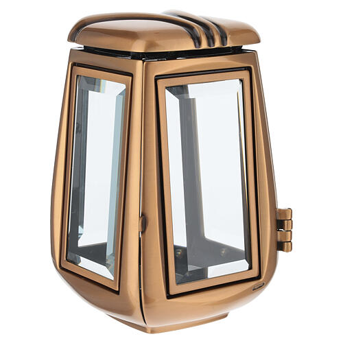 Shaped cemetery ground votive candle holder lamp, 25 cm, bronze finish. Outdoor ground-mounted votive candle lamp made of metal with a bronze finish and a compact structure. The body features a contoured form with a rounded profile and a rectangular frontal panel completed by a clear glass insert set in a metal frame. The configuration includes an internal flame guard and fixing pins for ground anchoring, with a side hinged opening for access to the candle chamber. Designed for ground installation in outdoor cemetery settings, it provides stable anchoring and allows direct handling of the votive candle. Made in Italy by an artistic foundry through metal casting and manual finishing processes. Overall dimensions: 24.5x15x8.5 cm. Compatible with votive candles or tealights 7 cm in diameter.