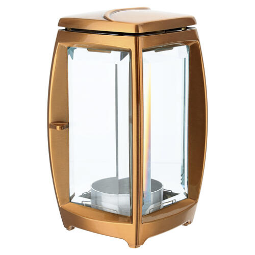 Square Bronzed Cemetery Lamp for 6.5 cm Candles. Cemetery candle holder lamp, designed to be fixed to the ground with the included mounting pins. This square-profile lamp is adorned with 4 large windows with thick cut glass. Suitable for outdoor display, protected by a special finish against the elements. Suited for candles up to 6.5 cm in diameter and 18 cm in height. Overall dimensions are 23 cm in height and a maximum diameter of 12.5 cm. Ground space required is 11x11 cm. Handcrafted in Ital...