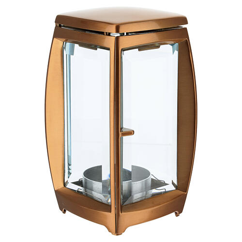 Votive Candle Holder Fiore Line polished bronze for 6 cm diameter candles. This votive candle holder for graves, made of brass with burnished bronze finish and protective patina for extreme durability against outdoor elements. Suitable for candles with a maximum diameter of 6 cm and maximum height of 18 cm. The linear yet refined design is complemented by windows with thick baguette-cut crystals. The candle holder measures 23x12.5x12.5 cm with a ground footprint of 11.5x11.5 cm in diameter.
