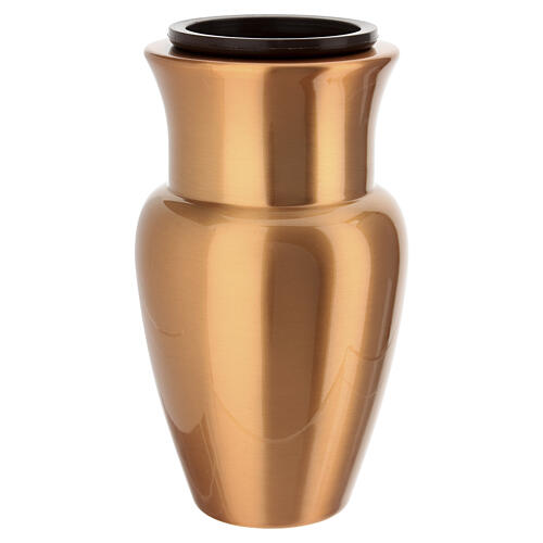 Bronze cemetery funeral flower vase 20x10. Ground cemetery flower vase made from a metal alloy with a bronze surface finish. The piece features a rounded body with continuous walls, a pronounced upper rim and a recessed circular mouth, giving a compact and regular profile. It is supplied with a plastic internal water insert and metal spikes for secure anchoring in the ground. Intended for permanent installation in outdoor cemetery settings, it ensures correct support for cut flowers with control of moisture and stable anchorage. Manufactured in Italy by an artistic foundry specialised in bronze cemetery accessories and decorations, using traditional casting and hand-finishing processes. Actual dimensions: 20 x 11.5 cm with an opening diameter of 6.5 cm.