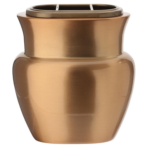 Bronzed oval outdoor flower vae, 19x17x9 cm. A bronzed flower vase with smooth, curved lines, supplied with a durable plastic water container divided into three sections for easy and controlled floral arrangements. Suitable for outdoor display and protected by an additional glossy patina against the effects of the elements. Prepared for ground fixing, this planter is delivered with anchoring pins for the base. The planter measures 19x17x9 cm with an opening of 12.5x6.5 cm. The internal plastic c...