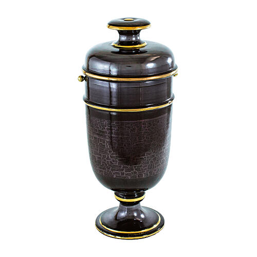Black amphora urn with gold details 18x51 5lt. Classic and refined ceramic cinerary urn inspired by ancient amphorae, symbol of memory and safekeeping. The surface in an elegant glossy black tone is embellished with sophisticated golden details, enhancing its slender shape. Adding uniqueness to the urn is a precious marble effect that adds depth and value to the whole, creating a refined balance between tradition and modernity. With its significant dimensions, this urn serves as a prominent and valuable commemorative piece. Crafted with high-quality ceramic enamels and colors, it has undergone a double firing at 900°C, ensuring durability over time. Each urn comes with an ash bag resistant to high temperatures. Dimensions: height 51 cm, circumference 18 cm.