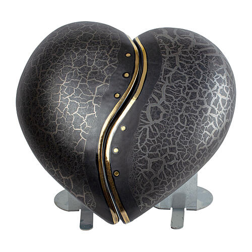 Black heart urn with gold marble details 14x30x29 5lt. Ceramic cremation urn with an original and refined design, featuring a delicate black heart shape. An elegant gold line, coupled with refined gold dots, harmoniously divides the heart into two parts, enhancing its aesthetic balance. Completing the design, a sophisticated black and gold marble effect adds depth and value to the whole. Made with high-quality ceramic enamels and colors, double-fired at 900°C for durability and longevity. Each u...