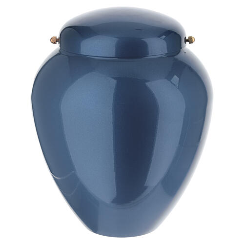 Blue metallized aluminum cremation urn, 25 cm. A cremation urn for ashes crafted from aluminum with a blue metallized finish and a capacity of 4.5 liters. The piece features a simple, rounded silhouette with a regular profile and a smooth, uniform surface, completed by a matching upper lid. The technical configuration includes an upper closure lid and an internal compartment dedicated to the containment of ashes. Suitable for cemetery or domestic use, the urn ensures stable placement and orderly management of its contents. Made in Italy at an artistic foundry specialized in aluminum work, produced through manual finishing processes characteristic of Made in Italy. Overall dimensions: 25 x 20 x 20 cm. The 4.5-liter capacity is suitable for a single adult of average build.