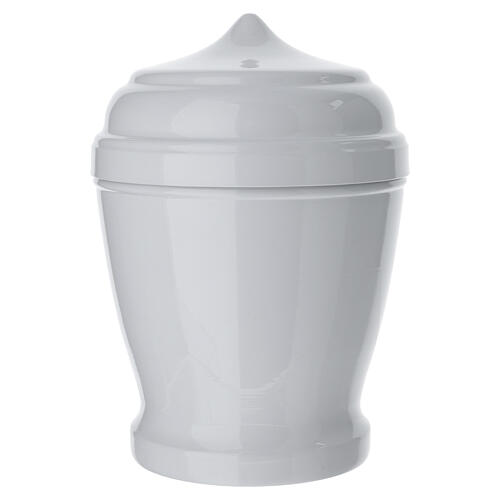 Classic white copper cremation urn, 4.5 Liters. Urn for ashes crafted from copper with a uniform light finish and a capacity of 4.5 liters. The piece features a classic silhouette with a tapered body and a shaped top lid, smooth surfaces and a continuous profile suitable for the long-term preservation of ashes. It is supplied with an internal bag for the secure containment of ashes. Intended for funeral use, it is designed to ensure protection, stability and correct conservation over time. Made ...