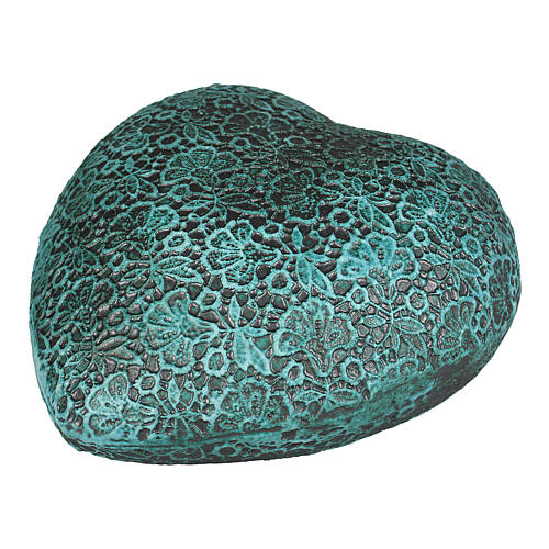 Heart urn with green and black relief flower effect, 14x30x29 5lt. Ceramic cremation urn with an original design, featuring a petrol green-colored heart shape embellished with black floral reliefs. Crafted with ceramic glazes and colors, double-fired at 900°C for strength and durability. Each funeral urn includes an ash bag resistant to high temperatures. Dimensions: height 14 cm, length 30 cm, depth 29 cm.