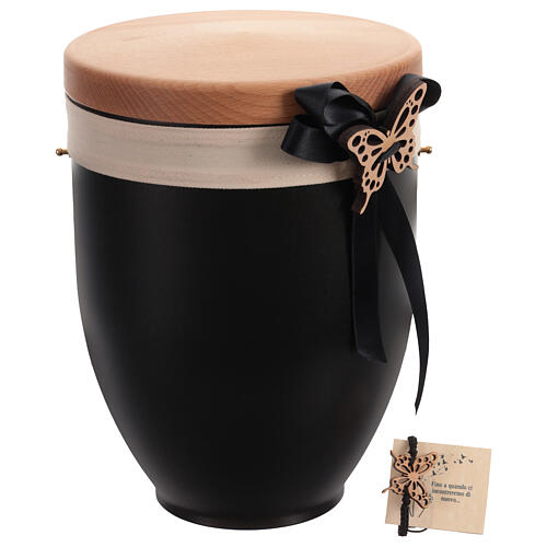 Metal cremation urn for ashes with wooden lid featuring a black bow butterfly. Matte black metal urn with a light wood lid, adorned with white and black bows and embellished with a delicately placed wooden butterfly on the black bow. It includes a matching bracelet with the same pendant as the urn and a macrame knitted cord. The urn includes a short dedication designed to sweetly accompany the memory. External dimensions: height 25 cm, width 18 cm. Internal dimensions: height 23 cm, width 18 cm. A modest, symbolic, and meaningful item signed by a company active in the funeral sector since 1966.
