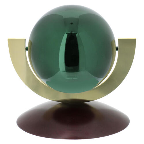 Ovation cremation urn with a spherical shape in green lacquered steel and a mahogany wood base. This urn for ashes features a hermetic, patented closure and an internal capacity of 3 liters, as required by EU and non-EU regulations. Memorial urns containing the ashes of the deceased can be kept at home, in cemeteries, tombs, family chapels, or other specially dedicated spaces. Made in Italy.