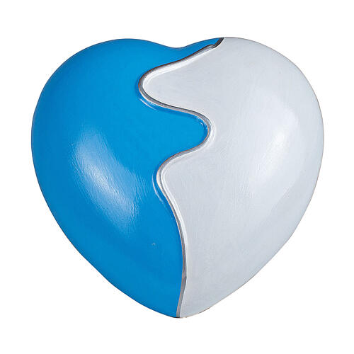 White and Blue Heart Urn 14x30x29 5L. Ceramic ash urn in the shape of a heart, elegantly divided in the center by a thin pearl gray line. The harmonious design features one half in blue and the other in white, creating a refined contrast.