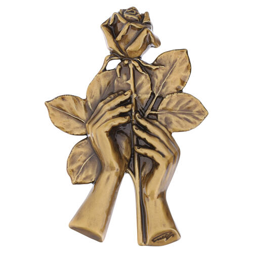 Bronzed plaque for outdoor use depicting two hands gently holding a fully opened rose. Designed for wall mounting and resistant to the elements thanks to an additional protective patina. Ready to be fitted to plaques and tombstones: drill a hole at the positions of the rear housings and secure using the fixing pins supplied, fastening them on the back with the included nuts. The grave plaque measures 13x8.5x1 cm. Made in Italy by a historic artistic foundry renowned for bronze casting for monuments and stone decorations; each piece is produced through numerous manual processes, resulting in a unique Made in Italy artifact.
