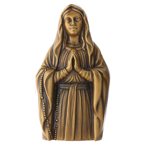 Bronzed Our Lady of Lourdes Plaque for outdoor use, depicting the bust of the Madonna of Lourdes with hands clasped in prayer and gazing upwards. Ideal for decorating niches and stone surfaces, this bronzed plaque withstands the elements thanks to the special protective patina applied. Measuring 15x8.5 cm, this relief plaque is ready to mount on the wall, with pre-drilled holes at the back and included compatible fixing pins. Crafted in Italy with high-quality materials, this piece undergoes several artisanal processes. The renowned historic foundry where it is produced specializes in creating durable and refined artistic monuments.