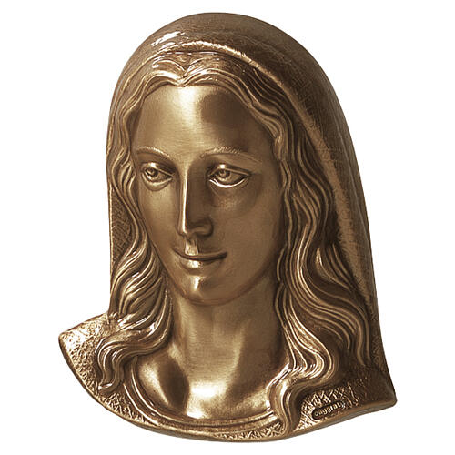 Bronzed relief plaque depicting the Virgin Mary's face, modelled in high relief and framed only by hair and veil. The Virgin is portrayed gazing to her right, making the plaque particularly suitable for placement on the right side of plaques, inscriptions, bases and tombstones. Ready for wall mounting, it includes compatible fixing pins for the pre-drilled holes on the back. Available in three sizes: 13x10 cm, 18x13 cm and 26x19.5 cm. Made in Italy from premium materials through multiple artisanal processes in a historic foundry renowned for producing durable and refined artistic and monumental works.