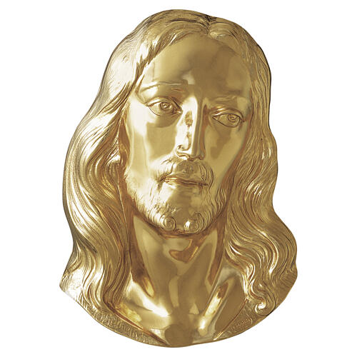 Golden Face of Jesus Plaque 18x12 cm for outdoor use. Suitable for outdoor display, depicting the adult face of Jesus in high relief. This brass-plated plaque is protected by a weather-resistant patina. The wall plaque is ready to be mounted: the two fixing holes are already provided on the back, and compatible pins are included. Perfect for decorating outdoor areas, niches, and stone surfaces. Measures 18x12x5 cm. This religious plaque is made in Italy, with high-quality materials and crafted through numerous artisanal processes. The historical foundry where it is produced is renowned for creating durable and refined artistic and monumental artifacts.