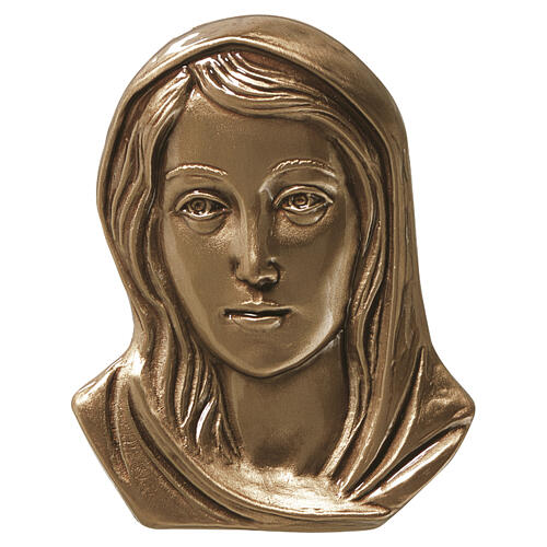 Outdoor Madonna face plaque with bronzed veil measuring 11x8 cm. Ideal for mounting on walls, niches, and tombstones, suitable for outdoor use thanks to a special protective patina. This Catholic plaque features low-relief sculpture of the Virgin Mary's face with bronzed veil. It is complete with mounting pins for easy installation. Crafted in Italy with top-quality materials through multiple artisanal processes. Produced in a renowned historical foundry known for durable and refined artistic monumental artifacts.