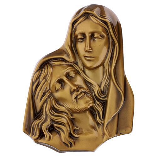 Bronze-finish cemetery wall plaque depicting the Pieta, designed for wall mounting. The composition presents a frontal bas-relief group with a compact arrangement and well-defined modelling of the figures, with a surface treatment appropriate for funerary and tombstone contexts. Supplied complete with dedicated mounting pins for secure fixing. Manufactured in Italy by a maker specialized in the funerary sector, produced using established casting techniques, with a protective surface treatment fo...