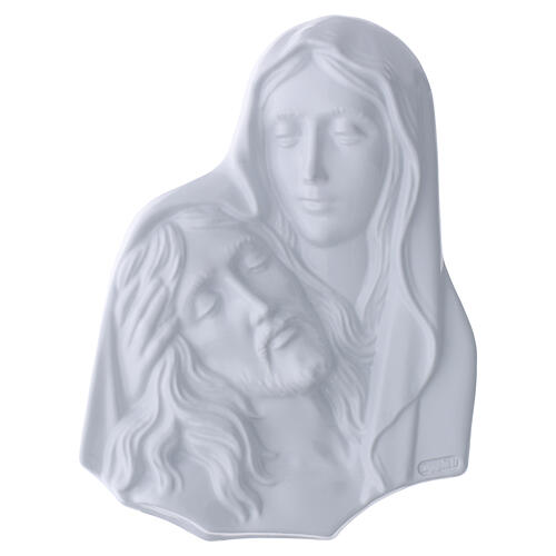 Pietà appliqué wall cemetery plaque depicting the Madonna supporting the body of Jesus Christ, with a uniform white finish and well-defined modelling of the volumes. This high-relief Christian cemetery wall decoration is suitable for mounting on gravestones, funeral markers, niches and monuments, and is designed for outdoor commemorative settings. The plaque is prepared for secure fixing to masonry or stone surfaces via a dedicated rear anchor. Available in two sizes: 18x13 cm and 26x19 cm. Handmade in Italy at a specialized workshop for stone decorations; artisanal processes certify its Made in Italy manufacture.