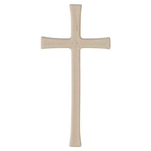 Beige glossy porcelain Latin cross for outdoor use. A simple-lined Latin cross in beige porcelain with a glossy finish; its sober, elegant design makes it ideal for decorating monuments, headstones and niches and is suitable for exterior installation. The reverse side features two recessed mounting slots to guide drilling of the wall or stone surface for insertion of the fixing plugs. Available in sizes 13x6.5 cm, 17.5x8.5 cm, 22x10.5 cm and 26x12 cm. Made in Italy by a historic artistic foundry renowned for its long tradition of excellence in bronze casting for monuments, stone decorations and durable liturgical-artistic objects. Each piece is produced through numerous manual stages that result in a unique Made in Italy artifact.