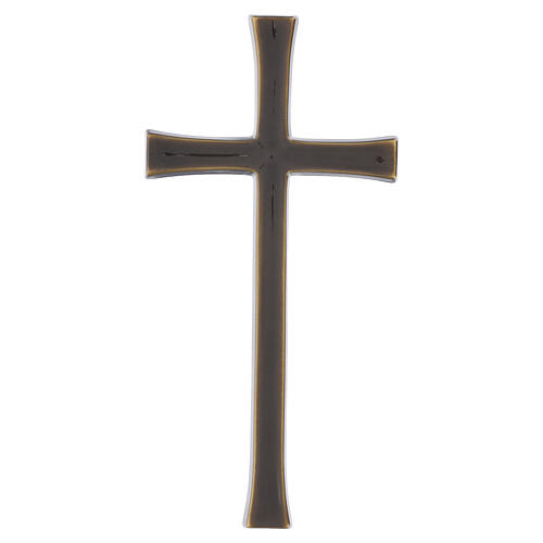 Wall-mounted funeral cross with a bronze finish. Made of metal with a linear design conceived for commemorative applications on vertical surfaces. The piece features a Latin cross with proportioned arms, a uniform section, an essential profile and surfaces treated for a sober appearance for cemeteries and graves. Manufactured in Italy by an artistic foundry with a long tradition in funerary art, produced using established techniques and manual finishing focused on formal precision and long-term durability. Supplied with mounting pins for wall fixing. Available in size variants with actual dimensions: 15 x 8 cm, 20 x 10 cm and 25 x 12 cm.