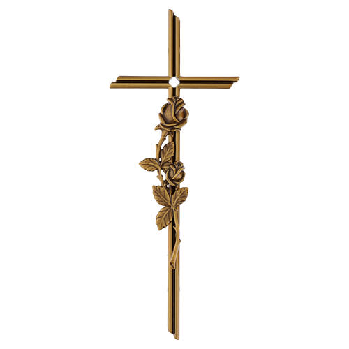 Bronze-finished funeral wall cross with decorative rose, 40 cm. Wall-mounted grave cross with an integrated floral motif, made from a metal alloy with a bronze finish and a balanced vertical profile suitable for commemorative installations. The structure features a Latin cross with linear arms and a modelled central rose, an elongated shaft enriched with shaped leaves, and uniformly treated surfaces for orderly placement on walls and stone supports. Manufactured in Italy by an artistic foundry s...