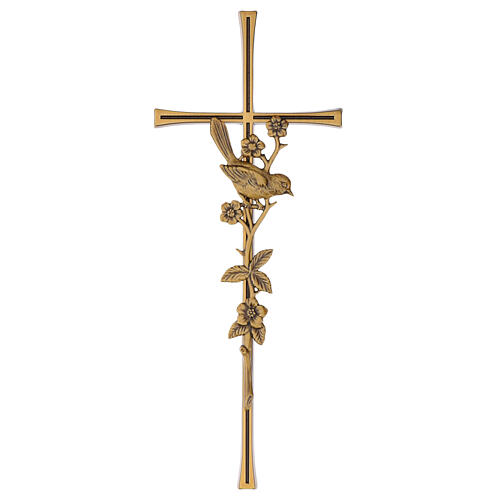 Bronze outdoor wall cross with bird and flowers, 40x16 cm. A bronzed wall cross formed by a Latin cross with central grooves and an applied depiction of a flowering branch on which a small bird rests. Suitable for outdoor display and ideal for embellishing plaques, headstones and monuments. The grave cross is supplied with the accessories required for installation: the rear houses fittings compatible with the included fixing pins. Measures 40 x 16 x 1.5 cm.