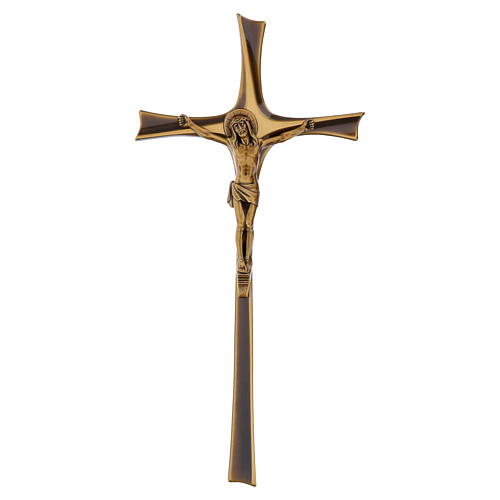 Bronze outdoor wall cross with Christ, 40 x 20 cm. Wall-mounted cemetery crucifix cross with a figure of Christ made of metal alloy with a bronze finish. The structure features shaped arms with tapered ends and a raised central section portraying the crucified Christ, with defined modeling and a continuous bronzed surface. The bronze cross is supplied with rear metal pins for direct wall mounting on stone or masonry supports. It is intended for outdoor installation in cemeteries and designed for stable mounting on headstones, monuments, and commemorative plaques. Produced in Italy at an artistic foundry specialized in bronze casting for sacred symbols and cemetery accessories, finished through manual workmanship and traditional processes.