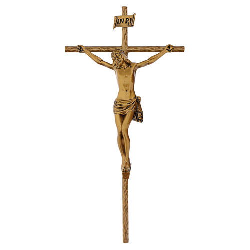 Bronze outdoor wall cross with Christ, 45 x 25 cm. Wal funerary cross with Christ made of metal alloy with a bronze finish. The structure is composed of linear arms with a decorated section and a central figure of Christ in relief, characterized by a defined anatomical modeling and a uniform surface treatment. It comes with rear metal pins for direct wall mounting on stone or masonry surfaces. This item is intended for outdoor installation in cemeteries and is designed for stable mounting on gravestones, monuments, and commemorative supports. It is produced in Italy at an artistic foundry specializing in bronze casting for sacred symbols and funerary items, obtained through manual workmanship and traditional processes. The actual dimensions of the cross are 45 x 23 cm.