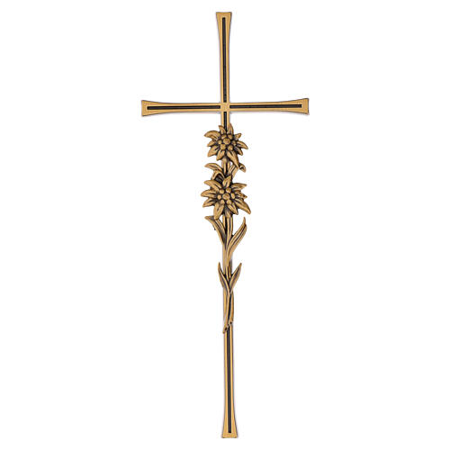 Bronze-plated outdoor cemetery wall cross with edelweiss in bloom, 40x16x1.5 cm. A bronze-plated wall cross enhanced by an applied edelweiss motif. Ideal for decorating plaques, niches and headstones outdoors, it is protected by a special weather‑resistant coating. The grave cross is prepared for easy wall mounting: the reverse includes housings for the fixing pins, which are supplied with the item. Measures 40x16x1.5 cm. Made in Italy by a historic artistic foundry with a long tradition of excellence in bronze casting for monuments, stone decorations and durable liturgical items. Each bronze wall cross is the result of numerous manual processes that produce a unique Made in Italy item.